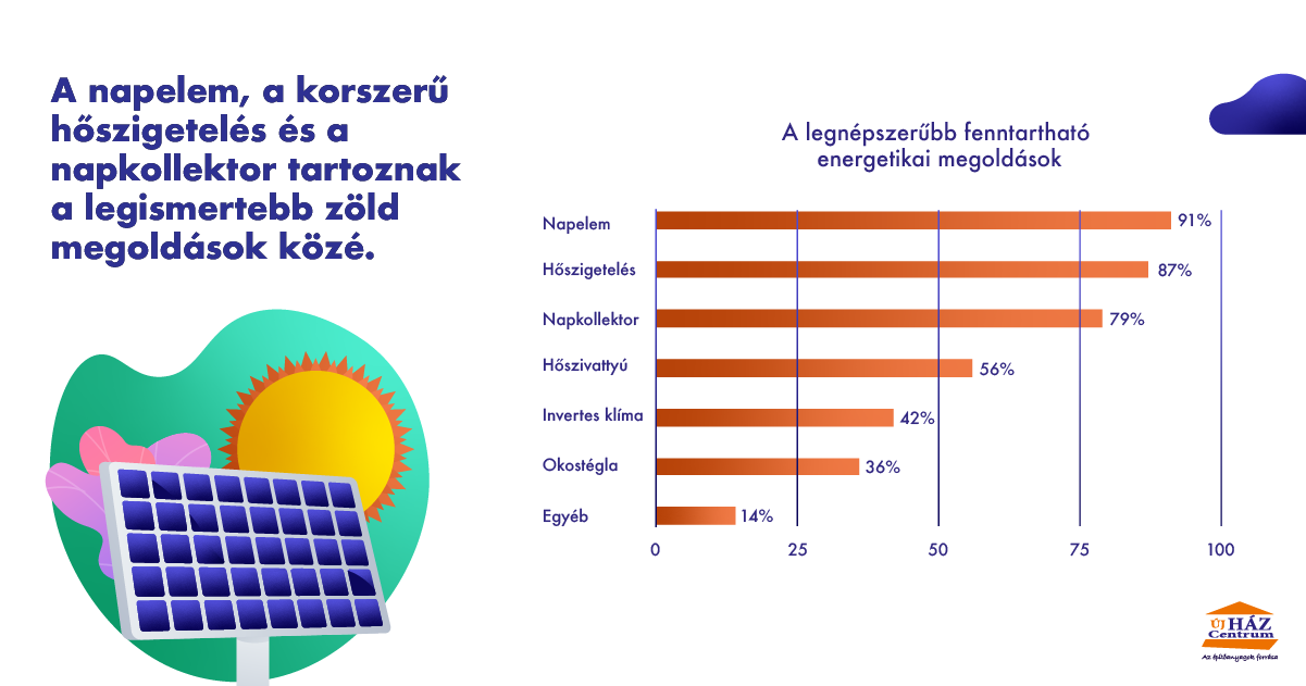 A környezetbarát energetikai megoldások közül egyértelműen a napelem (91 százalék), a korszerű hőszigetelés (87 százalék) és a napkollektor (79 százalék) ismertsége a legmagasabb, de a hőszivattyú (56 százalék), az inverteres klíma (42 százalék) és az okostégla (36 százalék) is a népszerű technológiák közé tartoznak. A válaszadók közel egyharmada a legköltségesebbnek a napelemet tartja a fenntartható megoldások közül, ezt követi a szintén kevésbé pénztárca-barátnak gondolt hőszivattyú (19 százalék), a napkollektor (18 százalék) és az okostégla (14 százalék). A lekérdezés eredményei szerint ezeket a technológiákat a férfiak 72 százaléka, és a nők kicsit több mint fele ismeri. A válaszadók 47 százaléka 3-4, további 38 százaléka pedig 5-6 különböző zöld technológiát tud beazonosítani, míg 15 százalék mindössze 1-2 ilyet ismer. A kutatás a fenntartható építőanyagok megítélésére is kitért: a kitöltők szerint a föld és az agyag a leginkább környezetbarát (44 százalék), míg a betonnak és a mészkőnek a legrosszabb (3-3 százalék) a megítélése a kitöltők körében.