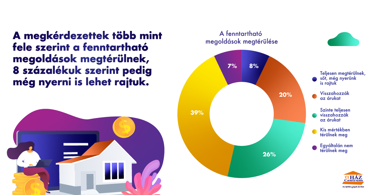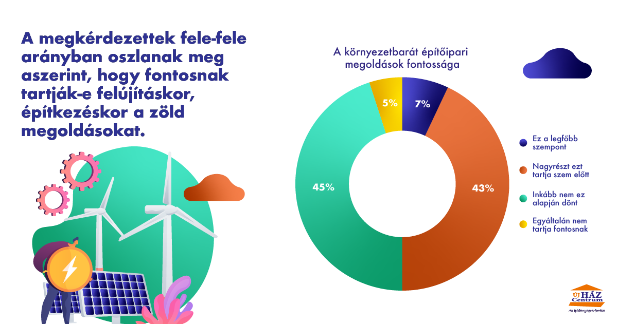 A felmérésből kiderült, hogy a lakosság felének számít a környezetvédelem, mikor építkezésbe, felújításba kezd, közülük 7 százalék számára pedig ez az elsődleges szempont az otthonteremtésnél. Bár a kitöltők több mint háromnegyede a fenntartható megoldások telepítését jóval költségesebbnek tartja a hagyományos technológiák alkalmazásánál, 54 százalékuk szerint ezek a befektetések megtérülnek.