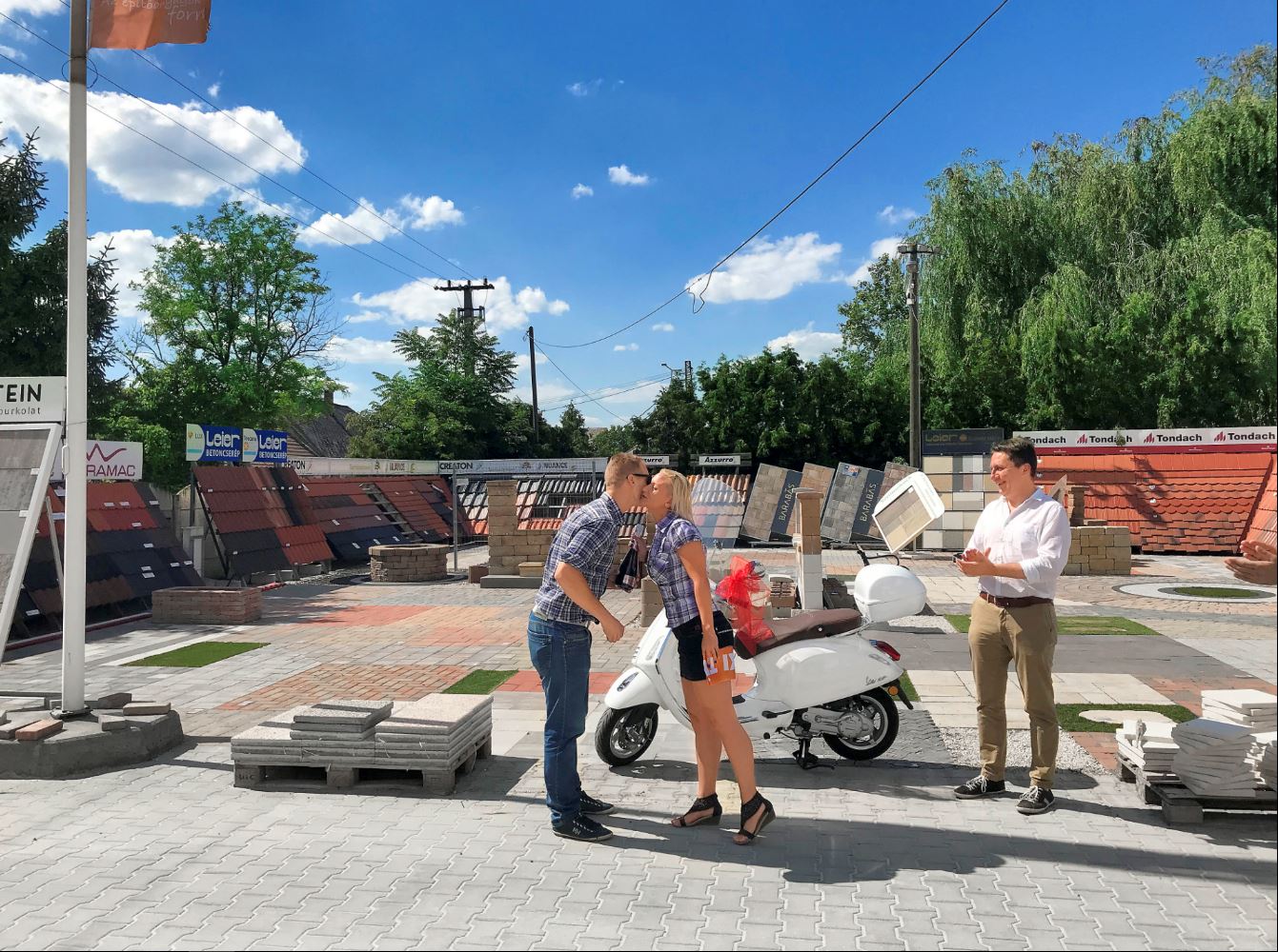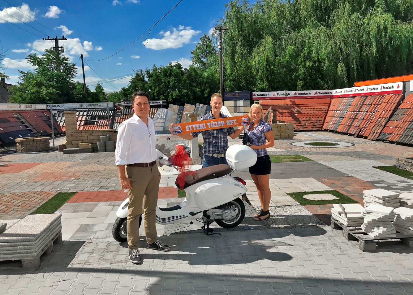 Az újHÁZ Centrum etyeki telephelyén vásárolt az a szerencsés építkező, aki július elején egy Vespa robogóval gazdagodott. Varga Ferenc a feleségét szeretné majd megtanítani a járgány használatának minden csínjára-bínjára.