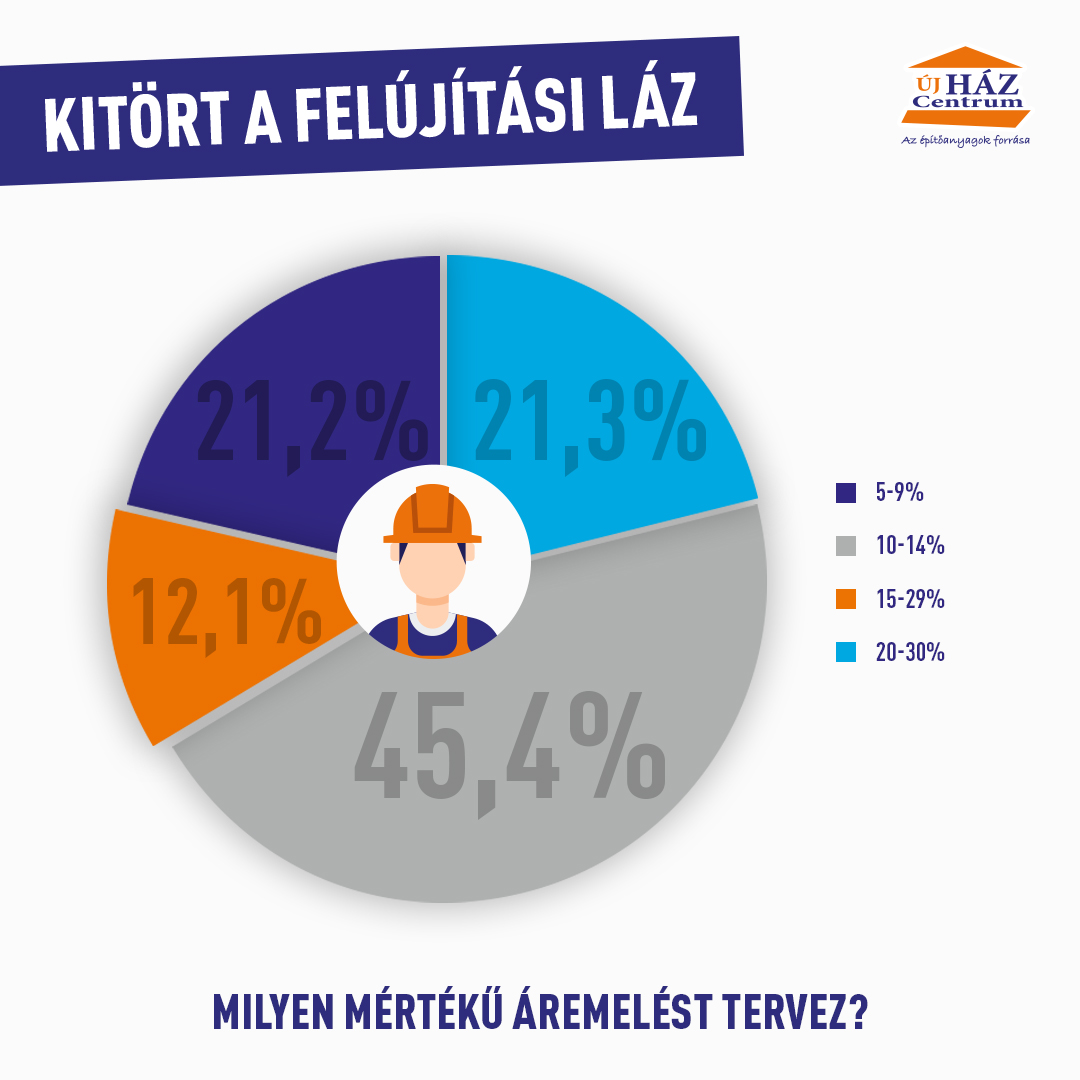 1. Az újHÁZ Centrum kivitelezők bevonásával készített kutatásából kiderült, hogy az építőipari szakemberek 42 százaléka munkadíjemelést prognosztizál, melynek mértéke az esetek csaknem felében 10-14 százalék körül mozog majd, így ezzel a többletkiadással célszerű számolniuk a megbízóknak.