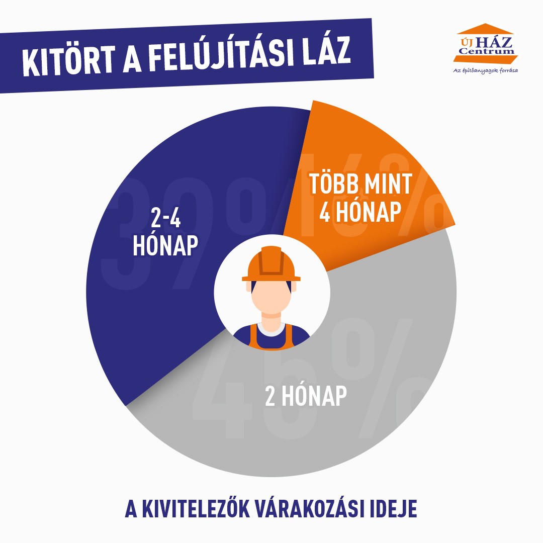 „Nem túlzás azt állítani, hogy a családok körében elképesztő méreteket ölt a felújítási láz, már a múlt év végén megrohamozták a kivitelezőket, hogy 2021-es munkákra lekössék őket” - húzzák alá. Ezt támasztja alá az újHÁZ Centrum közelmúltban, közel 100 szakkivitelező vásárlója körében végzett nem reprezentatív kutatása is, mely egyértelműen kimutatja, hogy a kivitelezők 45 százaléka két hónapra előre be van táblázva, 39 százalékuknak a munkái 2-4 hónap közötti időtartamra vannak lekötve, 16 százalékuk azonban már csak több mint négy hónapos várakozási idő mellett tud projekteket elvállalni.