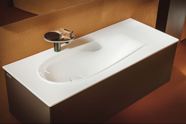 Az új, szabadon álló kád nagy és barátságos, formáját a mosdók ihlették. A Sentec-kel, egy bársonyos, érzéki felületet biztosító ásványi kompozittal készült kád ideális a hosszú regeneráló áztatáshoz. A vékony szegély kiszélesedik, hogy kényelmes fejtámlát és felületet biztosítson a tárgyak számára. Az új verzió – amely kívül fekete, belül fehér színben is kapható – nagy hatást kelt, tökéletesen illeszkedik a kollekció új felületeihez.