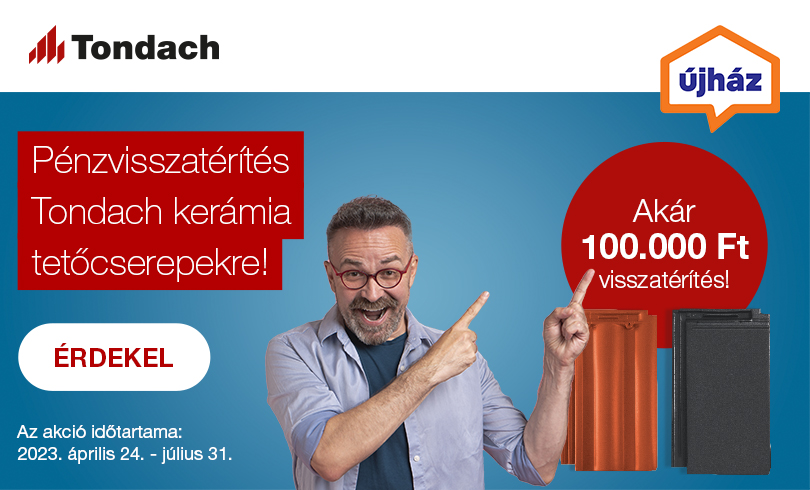 A Tondach kerámia tetőcserepekkel most nem csak időtállóan gyönyörű tetőt varázsolhat házára, hanem akár 100 000 Ft-ot is spórolhat. A Wienerberger Zrt. a Tondach kerámia tetőcserepek vásárlására szóló pénzvisszatérítési promóciót hirdet. A termékeket keresse az Újház kereskedéseiben!