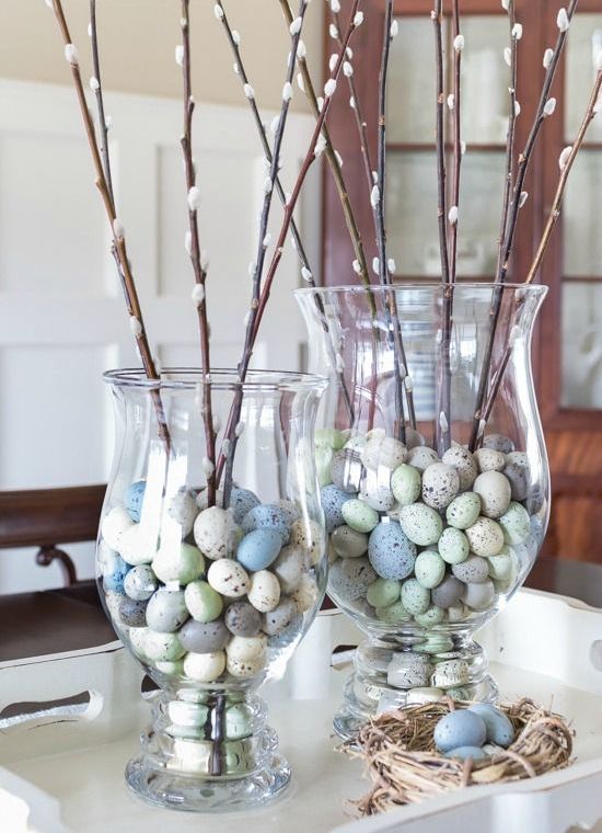 Ezúttal használjunk kisebb méretű tojásokat! Az előző pontban leírtakhoz hasonlóan fessük le és díszítsük őket kedvünkre. A megszáradt darabokat sorakoztassuk egy álló váza aljába, a méretre vágott barkaágat pedig ebbe szúrjuk bele. Kisebb méretű váza és növény esetén helyezzük az ünnepi asztalra, azonban ha nagyobb volumenű dekorációt készítünk, inkább helyezzük a bejárati ajtó elé vendégcsalogatónak.