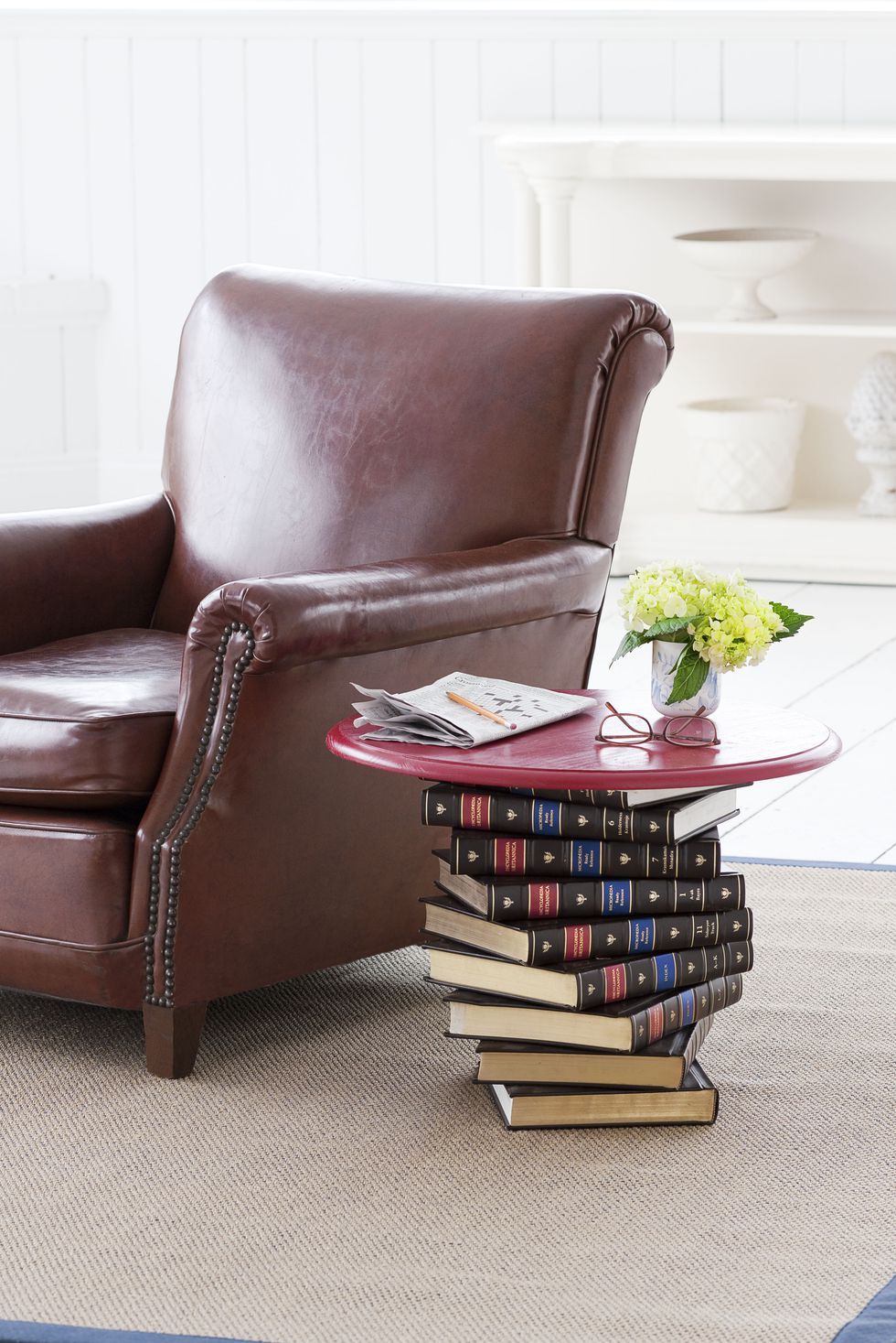 Erős ragasztóra, néhány nagyméretű, masszív könyvre és egy bútorlapra van szükség csupán ennek a gyönyörű dohányzóasztalnak az elkészítéséhez. Mielőtt azonban nekilátnánk ragasztani, érdemes leülni a fotelbe és lemérni, mi lenne a legkényelmesebb asztalmagasság számunkra. Ez alapján a könyvgerincek és a bútorlap vastagságának összeadásával számoljuk ki, hogy hány könyvre van szükségünk a bútordarab elkészítéséhez.
