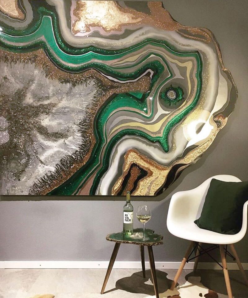A festékeket öntsük kis edényekbe, majd egymásra rétegezve csepegtessük a vászon alsó részére. Ezt követően óvatos, lágy mozdulatokkal oszlassuk szét a festéket a teljes felületen. A gyönyörű márvány mintázatú alkotás a kanapé fölé helyezve fókuszpontként is szolgálhat nappalinkban.