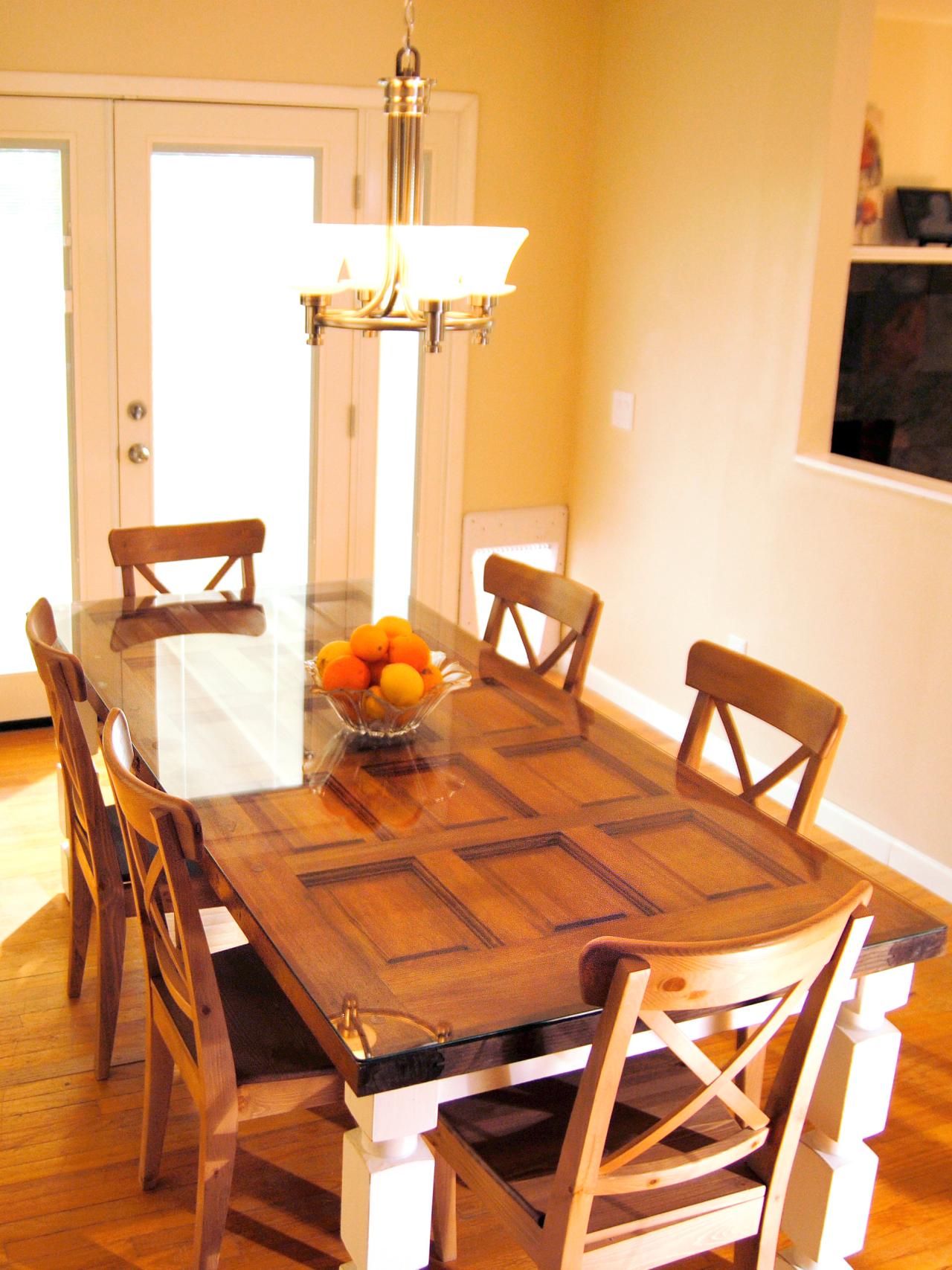 Egy szép, régi ajtó étkezőasztalként is újjá tud születni. Amennyiben festve van, szedjük le a rétegeket, hogy ismét előbukkanhasson a fa természetes erezete. Csiszoljuk simára géppel az ajtó mindkét oldalát, majd lazúrozzuk és lakkozzuk kedvünk szerint. A négy sarkára rögzítsünk masszív falábakat, a tetejére pedig szakemberrel vágassunk méretre egy üveglapot. Néhány óra alatt és pár ezer forintból el is készülhet egyedi asztalunk, amely a konyha vagy az étkező ékeként szolgálhat.