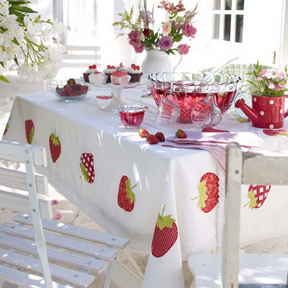 Akár kültéren, akár az étkezőben igazi vidám hangulatot tud kölcsönözni egy epres terítő. Tegyünk az asztalra egy csokor friss tulipánt, készítsünk egy nagy kancsó epres limonádét, és máris úgy érezhetjük magunkat, mintha otthonunkból kiszakadva egy epermennyországban relaxálnánk.
