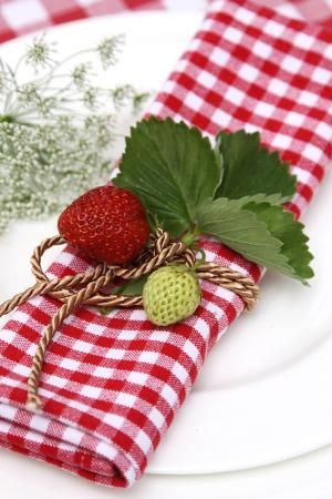A kerti partik igazi meglepetése lehet, ha élő érett eperből és a hozzátartozó kacsból készítünk szalvétagyűrűt. A textilszalvétát először kössük át natúr színű kötöző madzaggal, majd óvatosan vezessük át rajta az eperszemet, annak indáit és leveleit. Elképesztően mutatós, ugye?