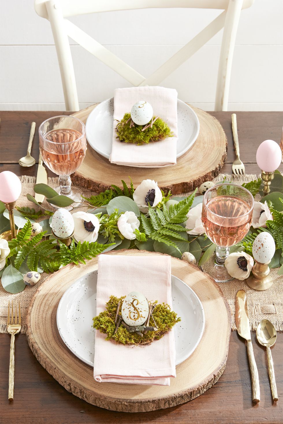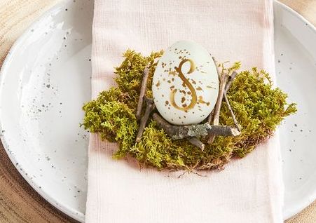 Papírszalvéta helyett válasszunk textil változatot, lehetőség szerint törekedjünk arra, hogy pasztell árnyalatú kerüljön az asztalra. Hajtogassuk egyszerűen, de ízlésesen, helyezzünk rá egy darab mohát, majd mehet rá a vendég monogramjával ellátott fehér-arany hímestojás is. A mohát bármelyik virágüzletben beszerezhetjük, az arany festék pedig a hobbiboltokban megvásárolható, ahogy azok a betűsablonok is, amik megkönnyítik vendégeink nevének kezdőbetűjének felfestését.