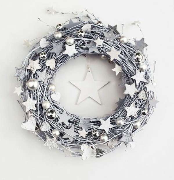 Vásároljunk egy szalma koszorúalapot, fújjuk le egyszínű szürkére, ezüstre vagy fehérre, és ragasztópisztoly segítségével díszítsük ki különböző apró csillagokkal. Selyemszalagból készítsünk egy kis akasztót és máris fellógathatjuk ajtónkra.
