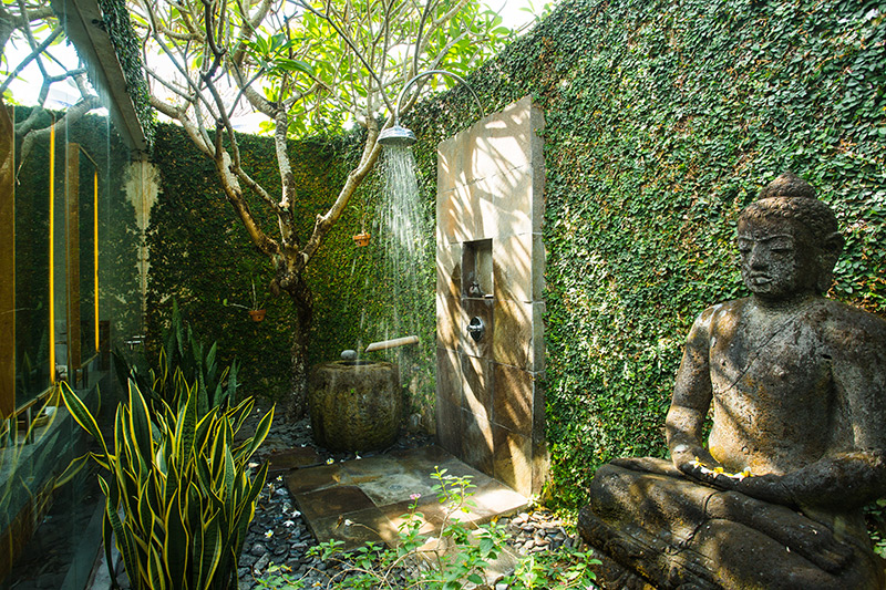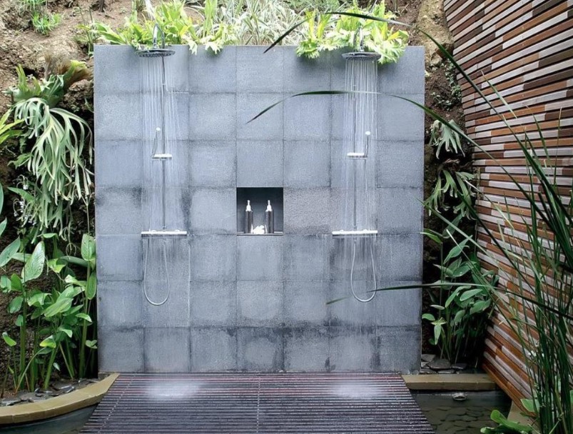 Az ízig-vérig trópusi pavilon kialakításához használjunk vízhatlan anyaggal bevont bambuszt, törekedjünk arra, hogy a zuhany környezetében minden a természetességet sugározza. Amennyiben pedig úgy döntünk, hogy kültéri spa részlegünket összekötjük a fürdőszobával, válasszunk nagyméretű kétszárnyú ajtókat, amelyek könnyű átjárhatóságot biztosítanak a helyiségek között.