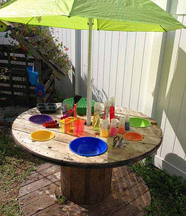 Állítsuk fel egy tetszőleges, árnyékos részen, a közepét pedig fúrjuk ki, hogy aztán belehelyezhessük a napernyőt. A kábeldob asztal részébe belesüllyeszthetjük a kerti tányérkákat, poharakat is, amelyeket egy mozdulattal kiemelhetünk használat után.