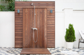 A zuhanyzóhelyiséget vékonyabb válaszfal padlótól a plafonig történő burkolásával is kialakíthatjuk. Ha pedig mindehhez egy mennyezeti zuhanypanelt is társítunk, a helyiségünk garantáltan felkelti majd vendégeink figyelmét.