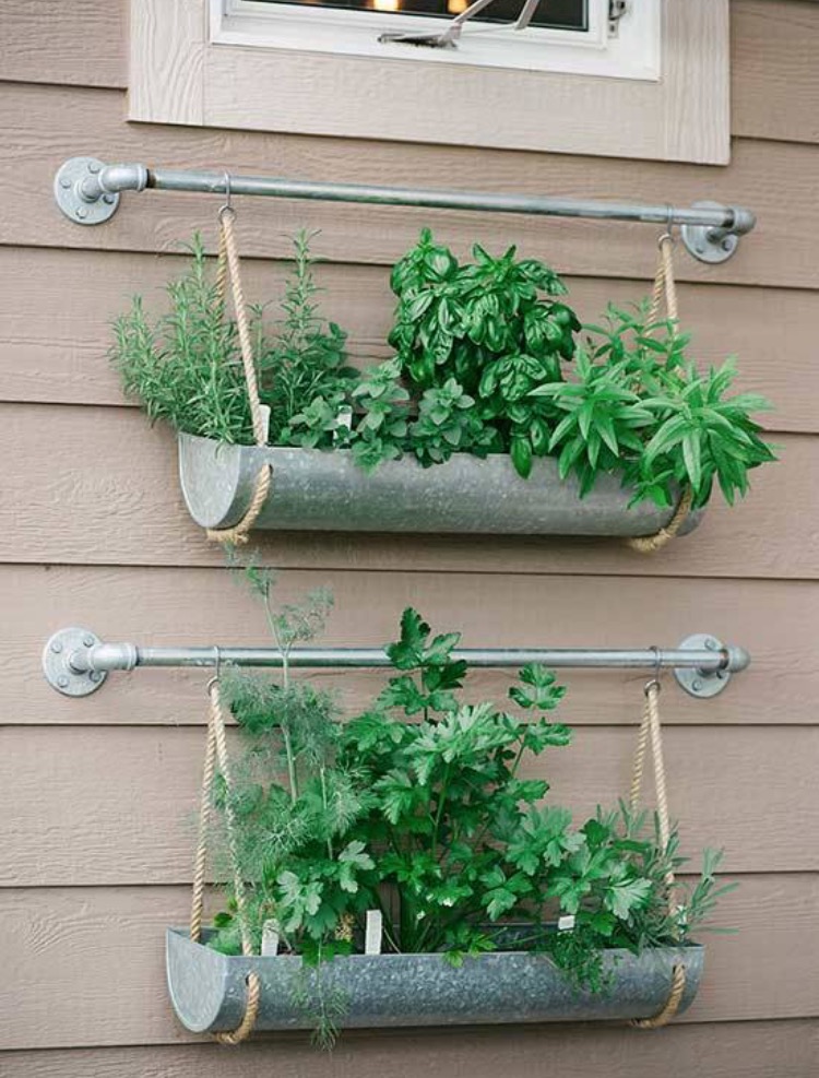 Az erkélyek dísze lehet a használaton kívüli ereszcsatornák átalakításából készülő virágtartók. Az íves bádoglemezeket felül, a két végénél fúrjuk ki és erősítsünk rájuk kötelet. A kötelekre kis kampókat is akasszunk, így az erélyünkről tökéletesen le tudjuk majd lógatni. Töltsük meg virágfölddel, mehetnek bele a virágok vagy a fűszernövények, és máris kész az egyedi, hangulatos, legfőképpen pedig újrahasznosítása miatt környezetbarát balkonládánk.