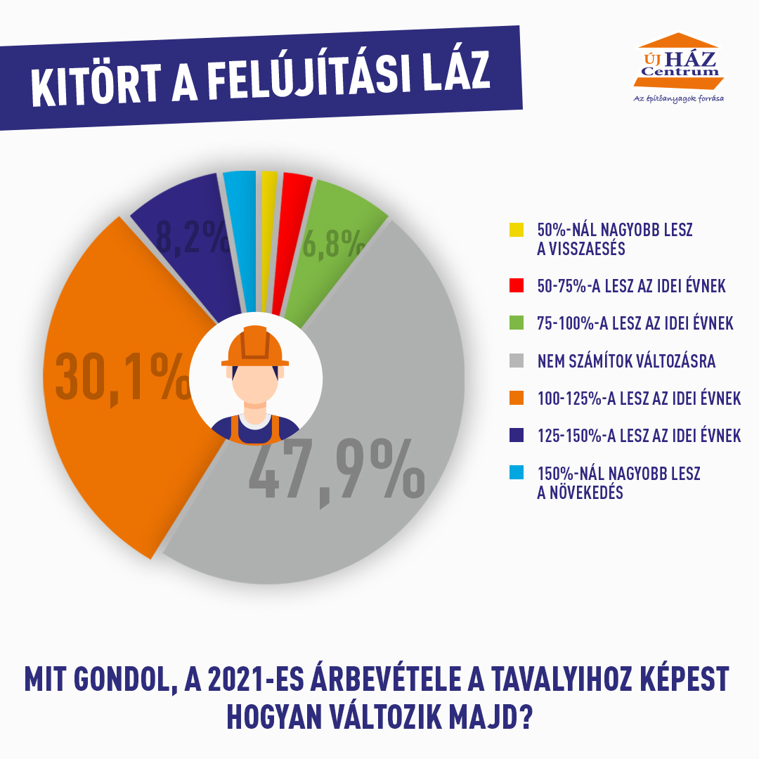 „Nem túlzás azt állítani, hogy a családok körében elképesztő méreteket ölt a felújítási láz, már a múlt év végén megrohamozták a kivitelezőket, hogy 2021-es munkákra lekössék őket”- húzzák alá, utalva a közelmúltban végzett nem reprezentatív kutatásukra. Az újHÁZ Centrum gödi és nagymarosi kereskedése, a Piramis Építőház Kft által szakkivitelezői vásárlóik körében készített kérdőíves felmérés rávilágított arra, hogy a kivitelezők 45 százaléka két hónapra előre be van táblázva, 39 százalékuknak a munkái 2-4 hónap közötti időtartamra vannak lekötve, 16 százalékuk azonban már csak több mint négy hónapos várakozási idő mellett tud projekteket elvállalni. Éppen ezért meglátásuk szerint érdemes mindkét félnek tudatos tárgyalásokat folytatnia a sikeres kivitelezés érdekében.