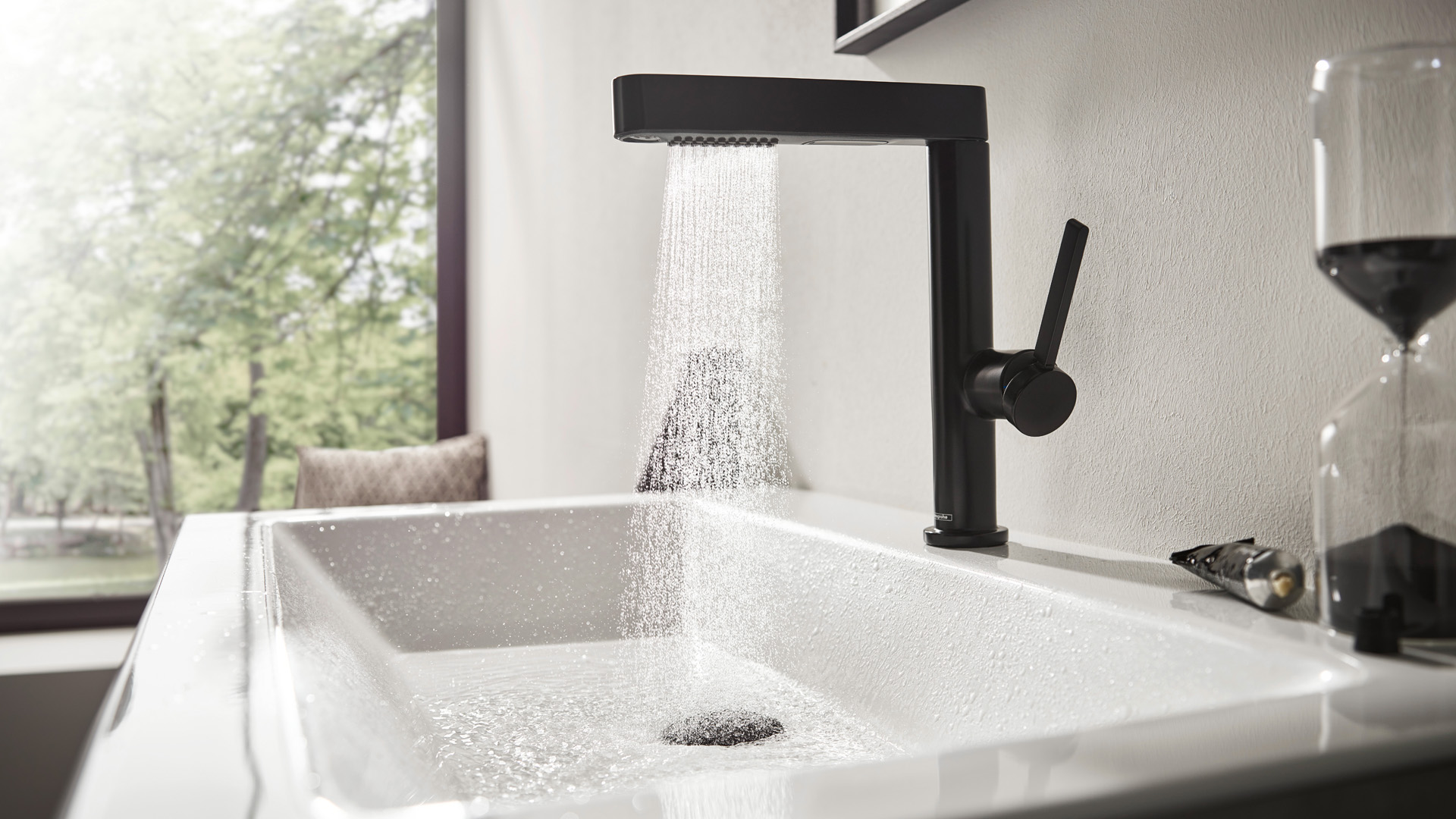 A különböző magasságú mosdócsaptelepek minden beépítési helyzethez a megfelelő megoldást kínálják. Váltás lamináris vízsugár és PowderRain között egyetlen gombnyomással történik.