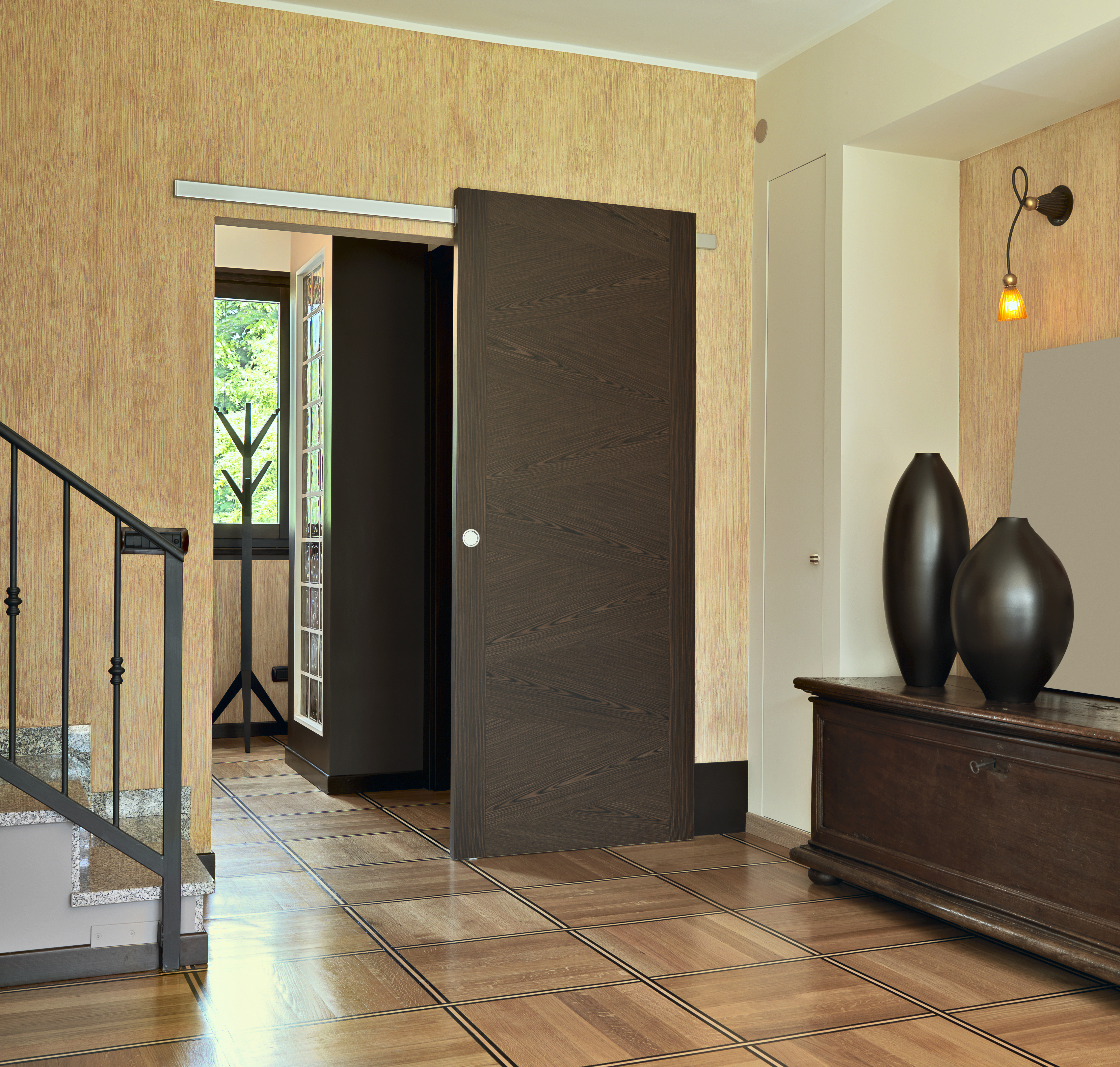 Az ajtó síkjában futó tolóajtó nagy előnye, hogy könnyen felszerelhető. Az ajtólap ebben az esetben görgők segítségével van egy sínrendszerre rögzítve. A síneket az ajtó megjelenéséhez igazodva lehet borítani, vagy kialakíthatunk az ajtólapnak egy, a lakás enteriőrjéhez igazodó dizájnos fogadó tokot. A leggyakoribb megoldás, hogy egy vezetőprofilt helyezünk el a fal mellett, így a lap kap egy viszonylagos stabilitást és attól sem kell félnünk, hogy elbotlunk a sínben. A háziasszonyok örömére ennél a megoldásnál a por sem ül meg a sínben, egyszerűbb takarítani, tisztán tartani.