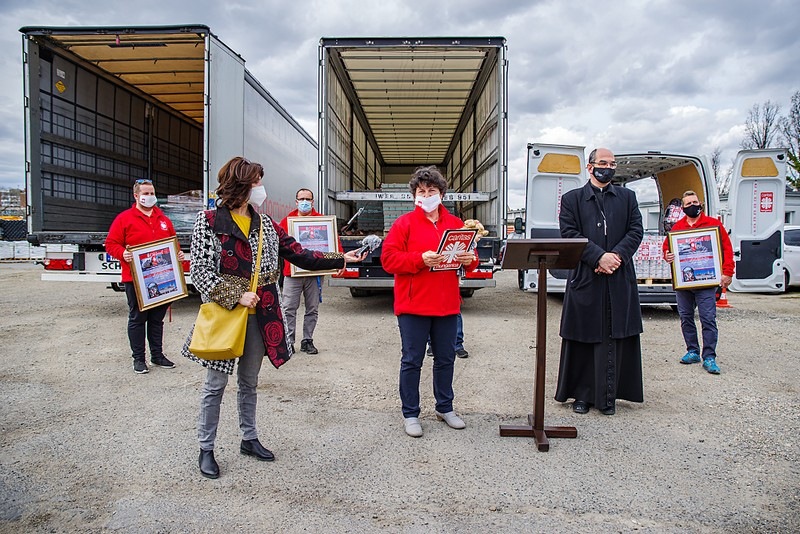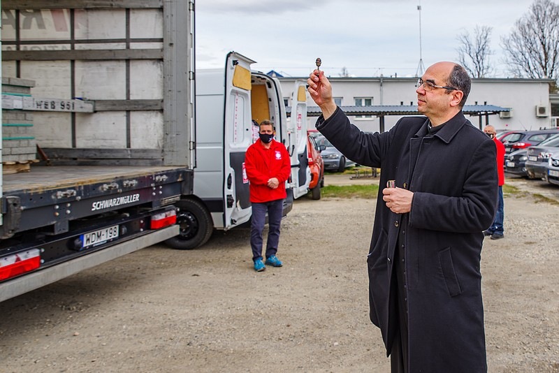 Dr. Székely János megyéspüspök az adományozó Gravitáció Kft. telephelyén tartott sajtótájékoztatón megáldotta a kedden útnak induló járműveket és az adományokat, majd elismerő okleveleket nyújtott át az adományozó Gravitáció Kft., valamint a szállítmányozási cégek ügyvezetőinek.