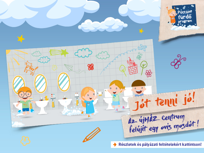 Május 2-án kezdődött a Pöttöm Fürdő Program, amelyre az óvodák június 30-ig pályázhatnak, hogy elnyerjék az újHÁZ Centrum egymillió forintos támogatását. A társadalmi felelősségvállalás jegyében vállalt cél, hogy a gyerekek által megálmodott és lerajzolt mosdót megalkossa a vállalat, és ezáltal komfortosabb környezetet teremtsen az ovisok számára.
